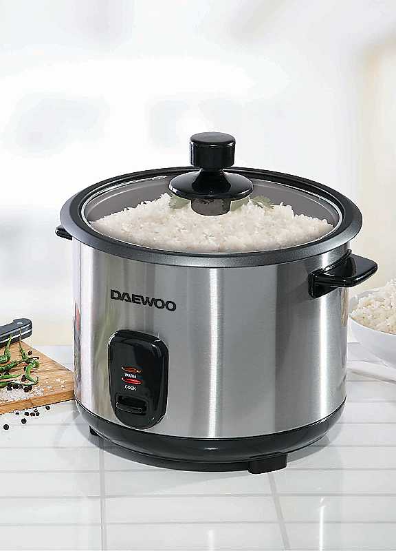 Enjoy perfectly cooked rice every time with our brand new Daewoo 1.8 litre rice cooker with non-stick coated, removable, easy to clean rice bowl, measuring cup and spatula included. With a smart and space saving design, this rice cooker will keep your kitchen surfaces clean and decluttered, use the cord storage to keep your counters tidy.A sturdy reinforced glass lid with steam vents prevents any spills, and the cool touch handle and exterior ensures safety.Brand: DaewooCapacity: 1.8 litreMeasuring cup & spatula includedDimensions approx. H28.7 x W28.5 x D27.9cm