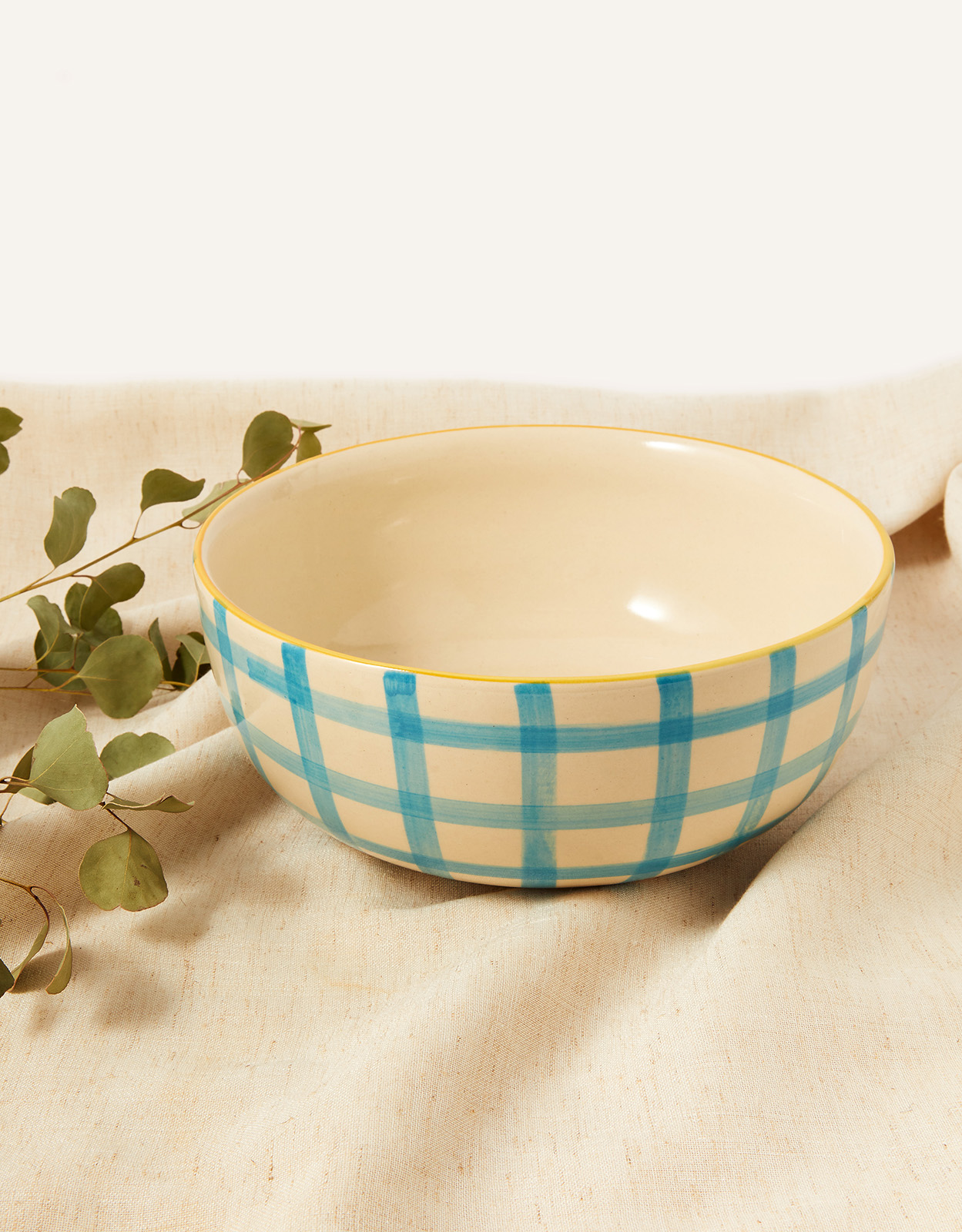 For your colour-exploding salads, this bowl is the perfect centre piece for your BBQ spread. Designed in ceramic, it's painted in blue check with yellow rims.