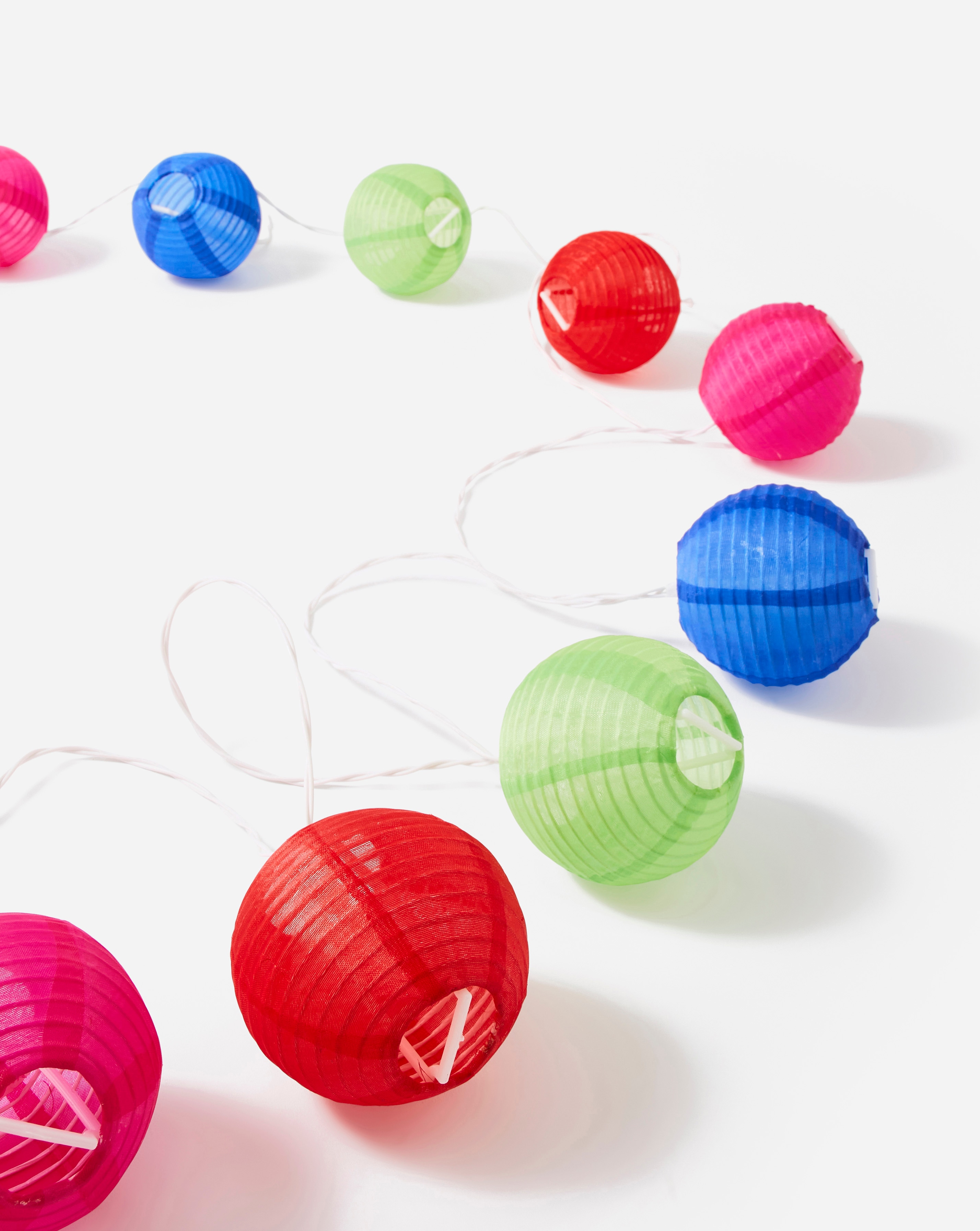 10 Paper Lantern battery operated Multicoloured String Lights, made from Nylon and Plastic. Easy fitting with timer. Suitable for both indoor and outdoor use. 10 LED, 4.5 Wattage. 12 months Manufacturer Guarantee. Wipe clean with soft cloth. Batteries not included. Made in China.