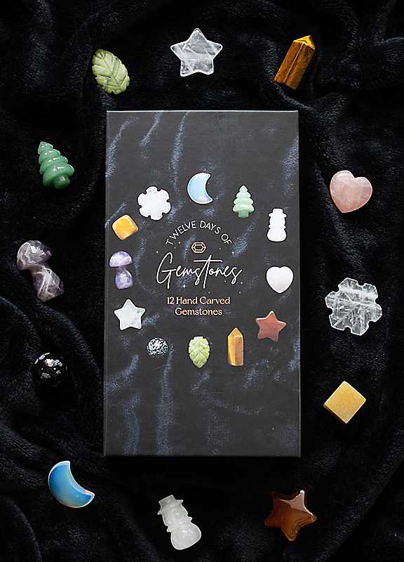 Count down the 12 days to Christmas with this mystical crystal advent calendar. Featuring 12 carved gemstones in fun and festive shapes, this calendar makes a special gift for the Christmas season. Stones include; an opalite moon, carnelian star, snowflake obsidian sphere, green aventurine Christmas tree, amethust mushroom, clear quartz snowman, rose quartz heart, clear quartz snowflake, clear quartz star, yellow aventurine cube, tiger's eye tower and a green jade leaf. Size, shape and colour of stones will vary, making each crystal unique.