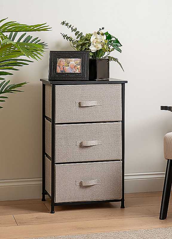 Add smart storage with a stylish twist to your space with this 3 drawer cabinet with beige fabric drawers. Sleek and versatile, this compact cabinet features a bold frame that contrasts beautifully with the soft beige fabric drawers, creating a modern, two-tone look that suits any room. The lightweight fabric drawers slide out smoothly, offering convenient storage for everything from accessories and stationery to everyday essentials. Whether placed in a bedroom, hallway or home office, this practical yet chic cabinet brings effortless organisation and contemporary charm to your home. Minimal assembly requiredDimensions approx. 73H x 45W x 30D cm Please remember to measure your available space before ordering. If using on an un-carpeted floor we recommend rubber or felt protection pads be used under the legs to avoid damage to your floors.