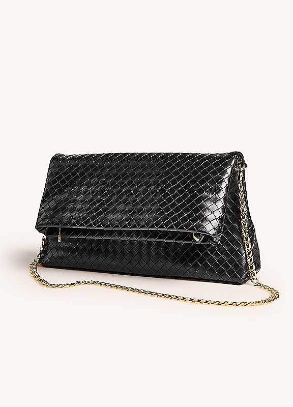 Elevate your style with the 365 by Freemans Black Willow Weave Clutch Bag. This sleek and sophisticated bag features a popper closure for added security and convenience. This clutch is versatile enough to pair with any outfit. Add a touch of elegance to your wardrobe with this must-have accessory.Faux LeatherDimensions approx. 17H x 30L x 6.5D cm | black evening clutch, black leather clutch, faux leather bag, foldover clutch bag, black woven clutch, clutch with gold chain, bag with chain strap, clutch with clasp, black crossbody purse, long strap bag