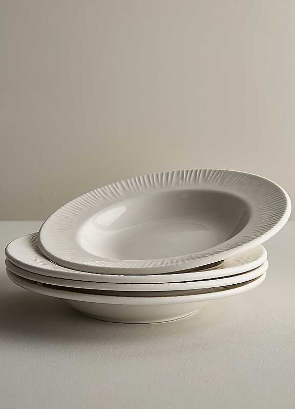 Elegant linear embossing with a pristine white glaze on pasta bowls. Set of 4 Dishwasher & Microwave Safe Porcelain Dimensions approx. 22D x 22W x 4H cm