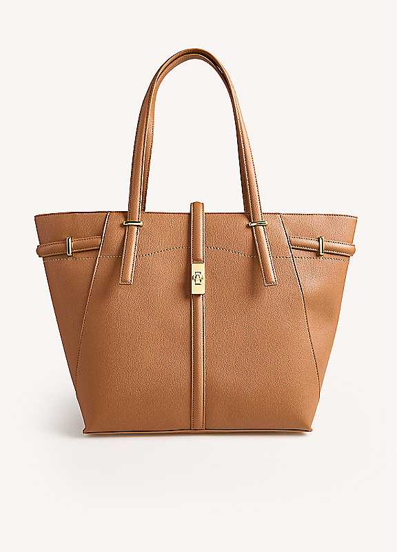 The 365 by Freemans Light Tan Tess Tote Bag is a stylish and practical accessory that will elevate your everyday look. Made with high-quality materials, this tote bag features a spacious interior and a popper closure for added security. Faux Leather Dimensions approx. 31H x 15W x 47L cm | fashion tote bag, top handle tote, purse clasp, classic tote bag, neutral tote bag, faux leather tote bag, bags brown, casual tote bag, casual shoulder bag