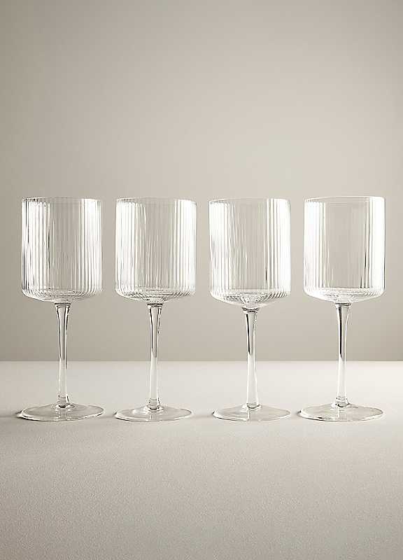 Pour your favourite wine into these stylish, modern ribbed wine glasses. Set of 4 Dishwasher Safe Glass Dimensions approx. 8.2W x 8.2D x 22H cm