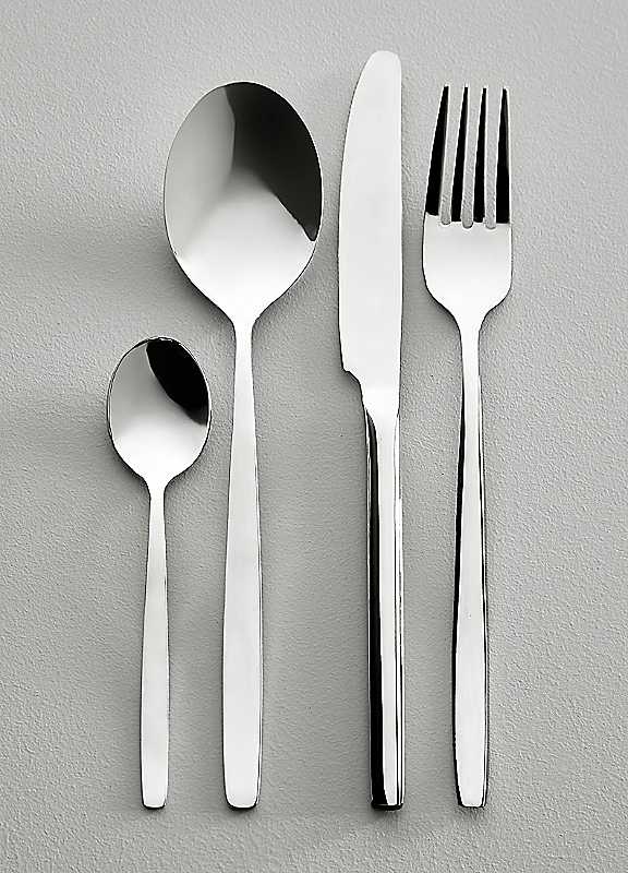 It does not lose usability in its modern lines and seeks a balance between modesty and boldness. Set consists: 6 of each - knives, forks, table & teaspoons. Dishwasher safe. Stainless Steel (18/0)