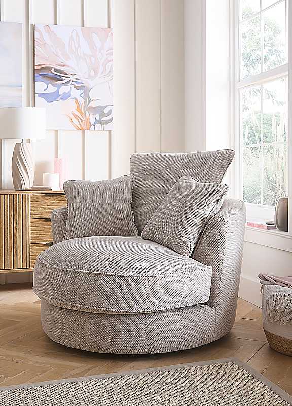 Designed for both comfort and durability, this swivel chair features a sprung seat and elasticated back webbing, paired with a high-performance Duoflex seat interior for long-lasting comfort. Fibre-filled standard backs are complemented by fibre-filled scatter cushions for a relaxed, inviting feel. Expertly crafted with a hardwood and composite board frame, the structure is reinforced using dowelled, screwed, glued, and stapled joinery for exceptional strength. To improve the longevity of your hand-made furniture, we recommend turning cushions often to ensure even wear over time. For further information on maintaining your furniture, please refer to the Care Guide located under the seat platform.Weight of product: 34kgOverall assembled dimensions approx. (H) 90cm x (W) 114cm x (D) 111cmArm height approx. 63 cmSeat Dimensions 104cmBack Dimensions 71cmWeight Capacity 110KgRemovable CushionsFloor to Seat 48cmLeg Material - PlasticSuggested number of people for assembly: 2Product Care - See Care Label100% PolyesterPlease remember to measure your available space before ordering. If using on an un-carpeted floor we recommend rubber or felt protection pads be used under the legs to avoid damage to your floors. Please note that product images on our website are for illustration only. We strive to show accurate colours, but variations may occur due to different device displays. Thank you for understanding! | fabric swivel chair, upholstered swivel chair, swivel accent chair, swivel chair