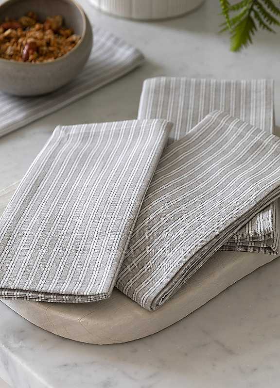 Add a touch of modern elegance with Woven Striped Napkins in Grey. This 4-pack, each 450 x 450 mm, features sleek stripes and a refined texture, perfect for any stylish table setting.Iron on low heatSet of 4Machine Washable at 30°C100% Cotton45 x 45cm