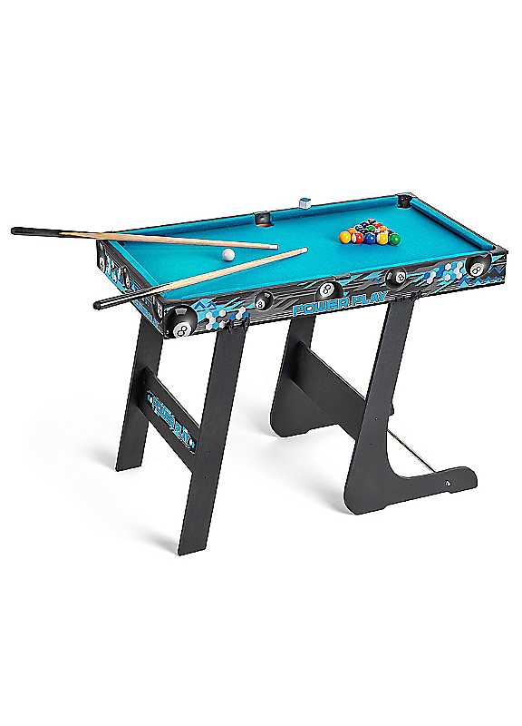 The Powerplay 3ft Folding Pool Games Table brings all the fun and excitement of a real pool game into your home in a compact and convenient design. Perfect for young players and beginners, this free-standing table is designed for easy setup and smooth gameplay, making it ideal for family fun, friendly competitions, or simply practicing your skills.Complete with two cues, 16 balls, a triangle, table brush, and chalk, this set provides everything needed to start playing straight away. The playing surface is designed to offer a smooth and consistent ball roll, giving players an authentic pool experience on a smaller scale. Whether you're working on precision shots or playing a fast-paced game with friends, this table is built to deliver hours of entertainment.One of its standout features is its clever foldable design, allowing it to be stored away quickly and easily when not in use. Simply fold the legs and tuck it away in a cupboard, against a wall, or under a bed, making it perfect for homes where space is limited. Despite its compact size, the table remains sturdy and durable, ensuring stability during every game.Designed for children aged five and above, the Powerplay 3ft Folding Pool Games Table is a fantastic way to introduce young players to the game while also helping to improve hand-eye coordination and concentration. The included accessories ensure that players can enjoy a complete pool experience without the need for additional purchases.Whether for a casual game at home, a weekend tournament, or a fun activity with friends, this folding pool table is the perfect addition to any game room.The 3ft folding pool table is the perfect addition for your family games night, bring the fun into your living roomThe kids' pool game table guarantees endless hours of fun & laughterA free-standing games table provides more stability, preventing it from tilting when children are playingThis game table will provide hours of entertainment for you & your childrenThis pool table features a foldable design for easy storage, making it perfect for homes with limited spaceIt can be stored in a cupboard, under a bed, or against a wall when not in useDesigned to provide a realistic game experience, the Power Play Pool Table ensures hours of entertainment for all agesPerfect entertainment for the whole family! An ideal birthday or Christmas present that will last a lifetime!Age Suitability: 3+Dimensions approx. 69H x 51W x 92L cmWARNING! Not suitable for children under 36months. Choking hazard, small balls. Adult assembly required. Please retain this information for future reference.