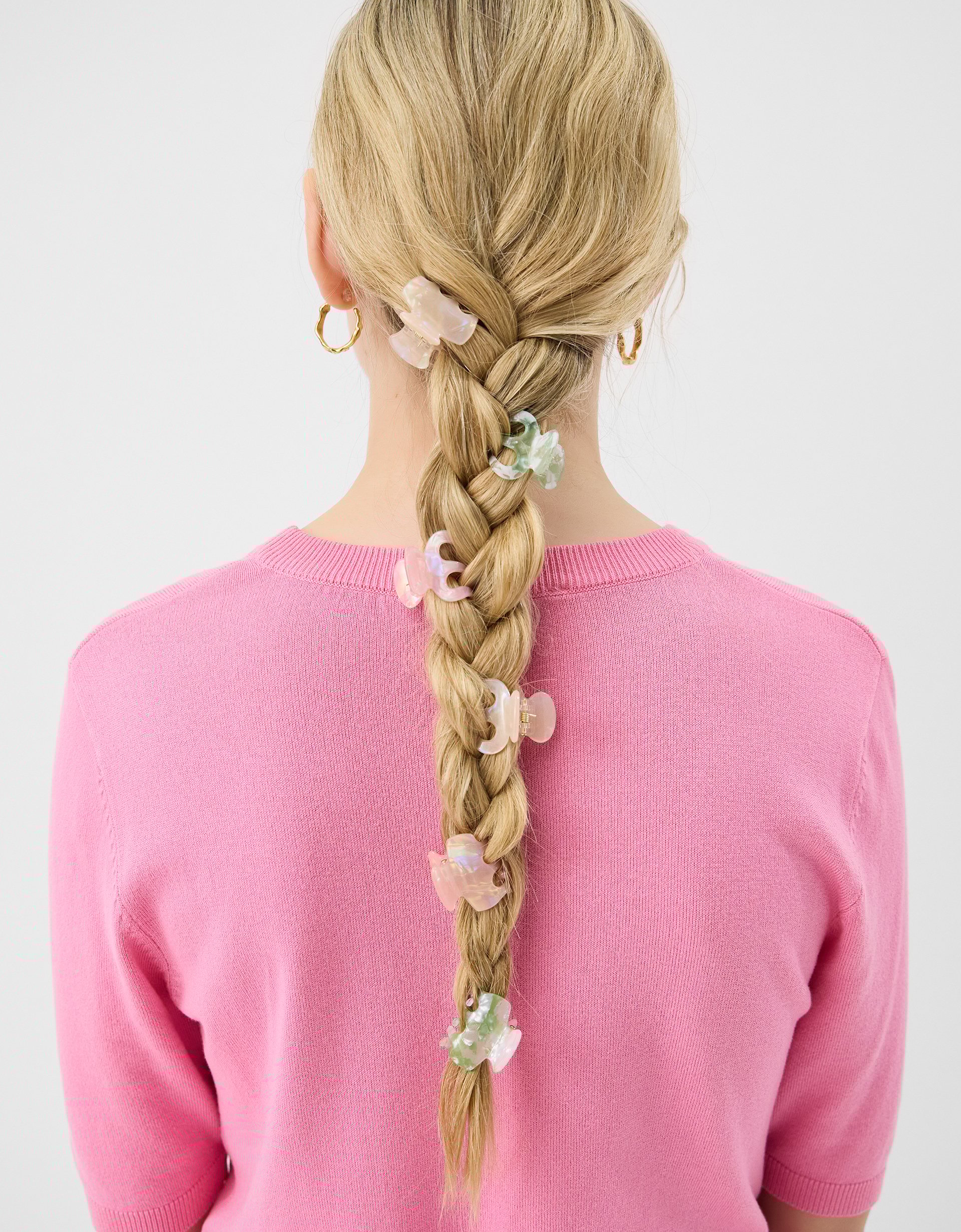 Designed in a mix of glittery resins, these claw clips are perfect for clipping back bangs, money pieces or wispy strays. You're welcome! Six included.