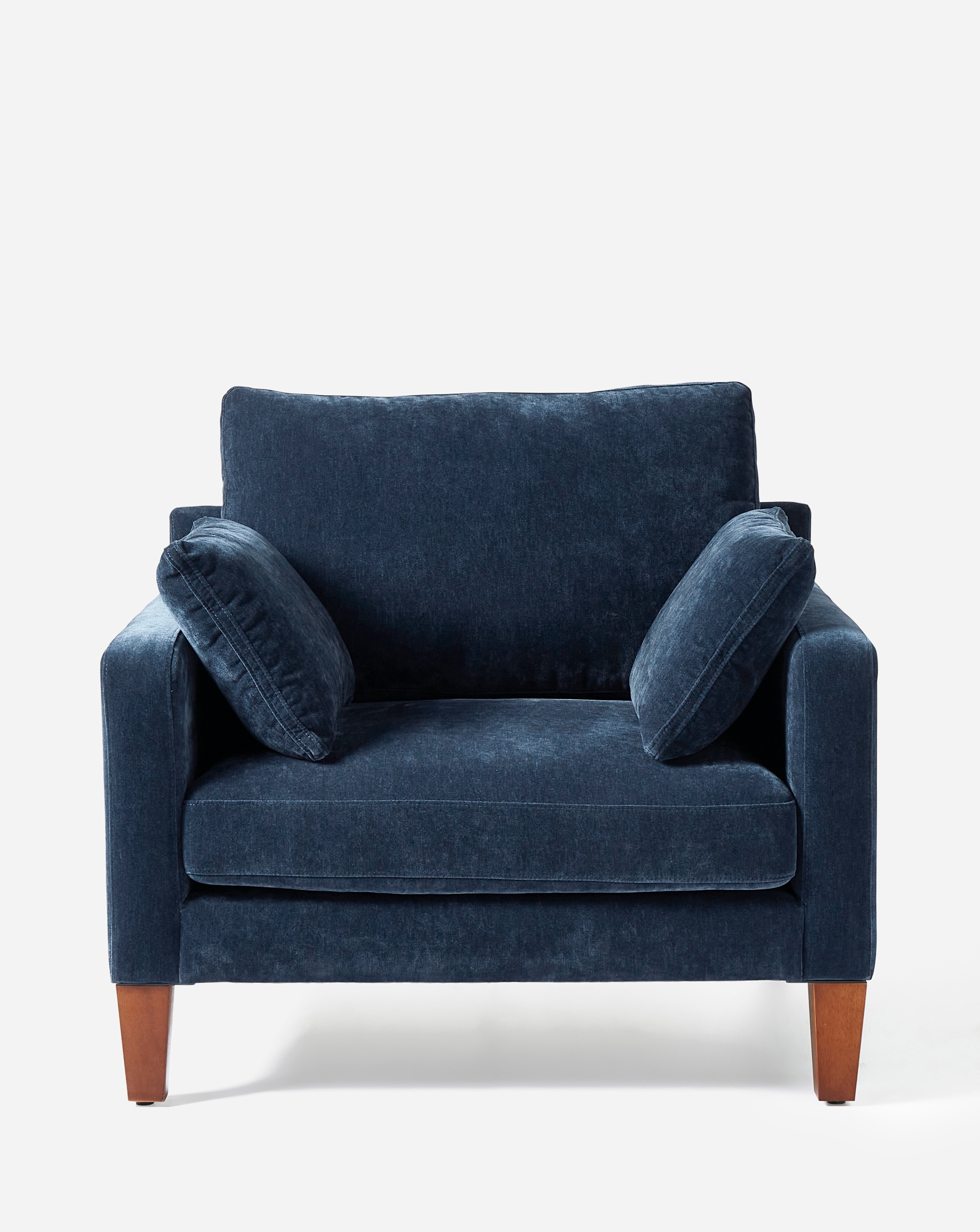 The Abbie Chenille Oversized Armchair features a comforable back and seat cushion, with 2 small pillows, all upholstered in a soft navy chenille fabric and finished with tapered square feet. Self assembly of feet required