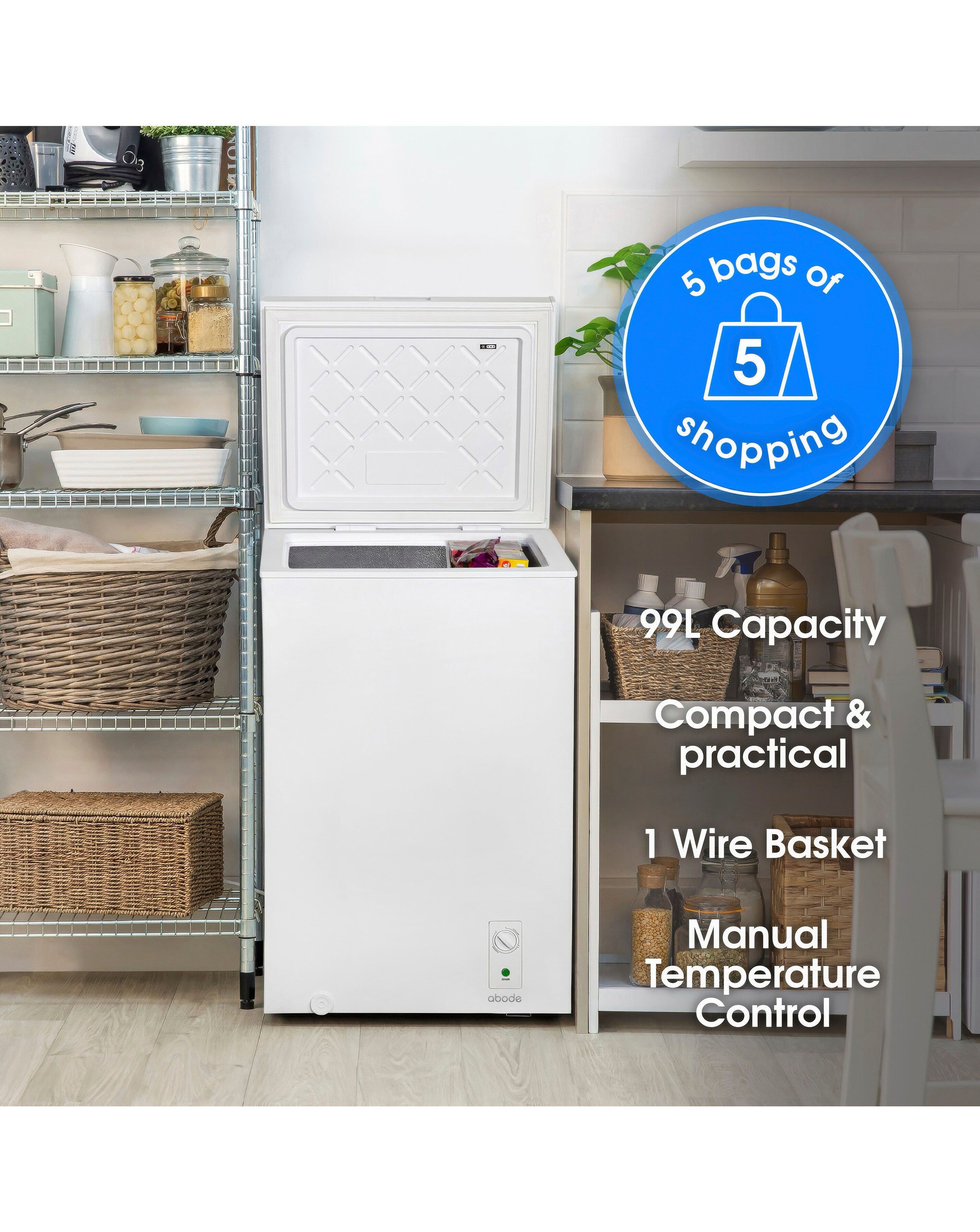 This Abode chest freezer is perfect if youre in need of extra freezer space. With an impressive 99L of storage, you can easily fit up to 5 bags of shopping, freeing up some room in your main freezer. This freezer also comes with adjustable feet to ensure that its stable on uneven grounds in your garage, outhouse or shed, keeping it out of the way. Thanks to the spacious interior, you can keep all of your family favourite batch cooked meals and frozen treats handy without worrying about running out of room. Plus, with the manual temperature control, you can ensure that your food is always kept at the perfect temperature for optimum freshness. Not only has this appliance been designed with you in mind, but with the environment too. This freezer has an E energy rating and low noise levels to minimise your carbon footprint whilst keeping your food fresh. For added peace of mind, this Abode chest freezer comes with a 1 Year Guarantee upon registration. This way, in the unlikely event something goes wrong, you know well always be on hand to help.