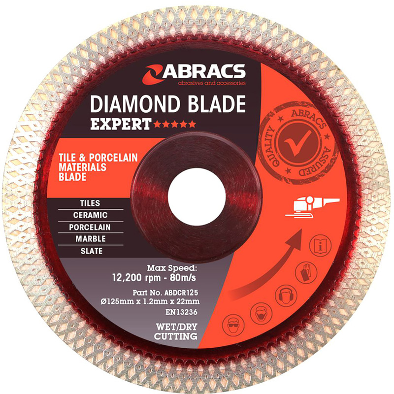 Abracs Tile & Porcelain Cutting Blade is designed with X Tech cutting technology for porcelain cutting as well as a range of tile and ceramic cutting applications. A 125mm diamond blade from the Abracs Expert series designed with X-Tech cutting technology – perfect for cutting porcelain as well as a variety of tiles and ceramics. The continuous X-Tech rim blade offers a combination of long life, clean cutting and excellent value. * 125mm cutting disc – with a 10mm segment height * 1.2mm blade thickness – ultra-thin for precision cuts * 22mm bore size – suitable for standard cutting tools * Continuous X-Tech rim – for tiles, porcelain or ceramics * Excellent value – long life and impressive performance | Abracs Tile & Porcelain Diamond Blade 125 x 22mm in Red