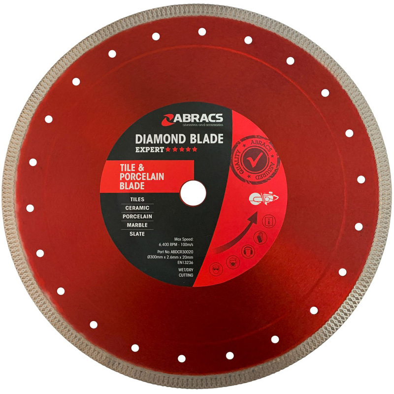 Abracs Tile & Porcelain Cutting Blade is designed with X Tech cutting technology for porcelain cutting as well as a range of tile and ceramic cutting applications. A 300mm diamond blade from the Abracs Expert series designed with X-Tech cutting technology – perfect for cutting porcelain as well as a variety of tiles and ceramics. The continuous X-Tech rim blade offers a combination of long life, clean cutting and excellent value. * 300mm cutting disc – with a 10mm segment height * 2.6mm blade thickness – for stable and accurate cuts * 20mm bore size – suitable for standard cutting tools * Continuous X-Tech rim – for tiles, porcelain or ceramics * Excellent value – long life and impressive performance | Abracs Tile & Porcelain Diamond Blade 300 x 20mm in Red