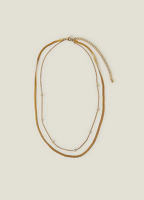 Part of the Z by Accessorize collection. Offering a layered look without any effort, this necklace is designed with a classic omega chain and shorter station necklace adorned with sparkling diamantes. Complete with a lobster clasp fastening and extender. Made from durable stainless steel and plated in 14 carat gold for a luxe, longer-lasting finish.Wipe clean95% Stainless Steel, 5% Cubic Zirconia