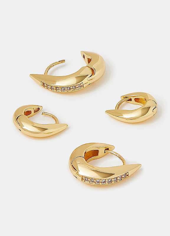 Part of the Z by Accessorize collection. Dazzling finishes and sparkly accents? We're totally hooked. Designed with a sleek clicker clasp fastening, these hoops showcase a sharp silhouette and diamante embellishments for a glam feel with modern edge. Plated in 14 carat gold for a luxe, longer-lasting finish. Two pairs of earrings included. Non-refundable.Wipe clean99% Brass (Recycled), 1% White Cubic ZirconLength approx. 1.65 cm