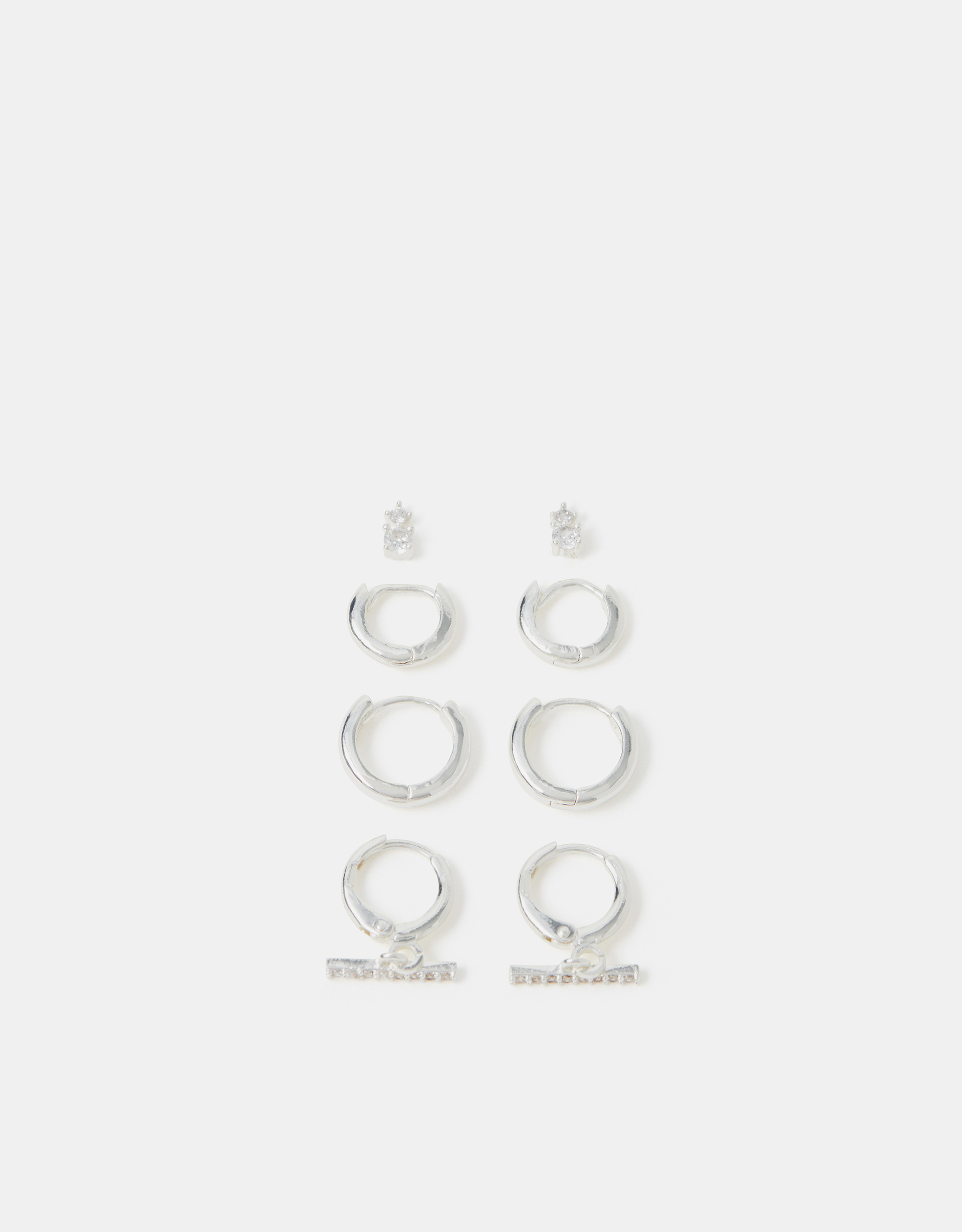Part of the Z by Accessorize collection: jewellery designed to dazzle and shine, it’s plated in sterling silver for a sparkling, longer-lasting finish. We continue raising the bar with these essential earrings. Featuring diamanté studs and huggie hoops designed with a T-bar pendant, this set meets every agenda and mood. *Immediately adds to the basket* Four pairs included. Non-refundable.