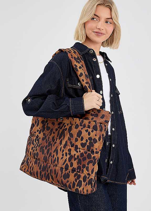 Go on, unleash your WILD side. Cloaked in a trendy animal print over the nylon fabric, this shopper bag features a soft quilted finish with a zip fastening and front slip pocket.Wipe cleanOuter & Lining: 100% Polyester (Recycled)Dimensions approx. 36H x 15W x 48L cm | quilted nylon tote, animal print tote bag, leopard print tote bag, handbag with zipper, nylon bag with zipper, quilted nylon bag, shopper nylon bag, leopard tote bag, tote bag with zipper, polyester carry bag, shopping bag polyester, tote bag with pockets, recycled polyester bag, puffy quilted tote bag, polyester shoulder bag