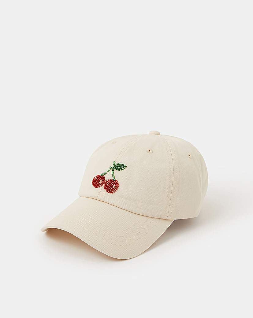 Beaded Cherry Baseball Cap Talk about a sparkly five-a-day, this cap features a beaded cherry on a neutral canvas. Perfect for pairing with a tee and jeans, you've got your weekend outfit sorted! Composite: Cotton 100%
