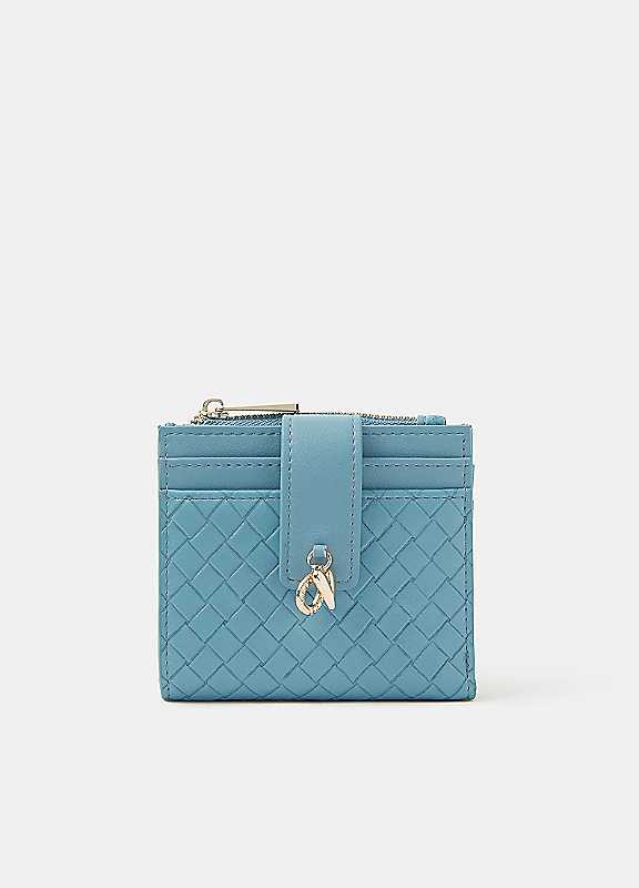 In need of a new purse? Today's your lucky day. Designed in blue with faux woven detailing, this purse features two card slots at the front and a zip pocket for change in the back. Open to find more card slots and a slip compartment for notes and receipts, too. Our favourite part? The gold-tone horseshoe and heart charms on the tab fastening.Wipe cleanOuter: 100% Polyurethane (PU)Lining: 100% Polyester (Recycled)Dimensions approx. 11L x 2W x 10H cm