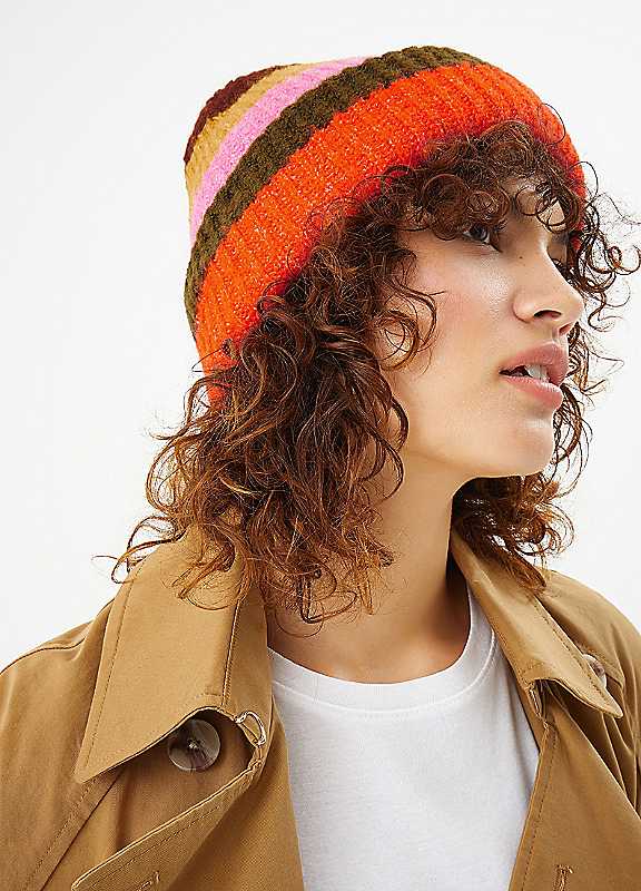Not only will this beanie brighten up your winter outfits, it'll brighten up everyone else's day, too. Knitted with stripes in striking colours, it's finished with a classic turned-up brim.Wipe clean97% Polyester, 3% ElastaneLength approx. 24 cm | multicolor hat, bright green hats, casual hats for ladies, casual hats, bright orange hats, ladies winter hats, beanie hat with brim, bright pink hats, womens casual hats, womens winter hat, colorful beanie, knitted beanie hat, casual beanie