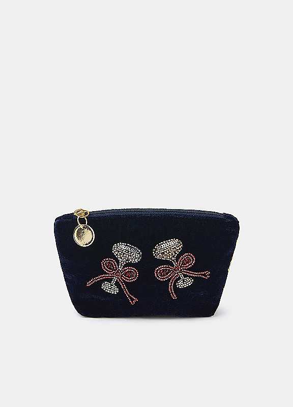 Raise a glass to this beautiful coin purse, perfect for gifting or keeping for yourself. Made from luxe velvet in navy blue, it's embellished with two champagne glasses tied with red bows. Cin Cin!Wipe cleanOuter & lining: 100% PolyesterDimensions approx. 15H x 5W x 21L cm