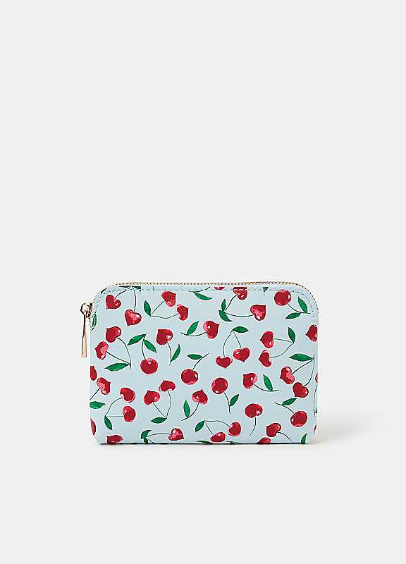 Patterned with everyone's favourite fruit, this faux-leather coin purse features dozens of cherries on a sky blue backdrop. Designed in a flat shape, it's perfect for any bag, even small totes. Pretty sweet, right?Outer: 100% Polyurethane (PU)Lining: 100% Polyester (Recycled)