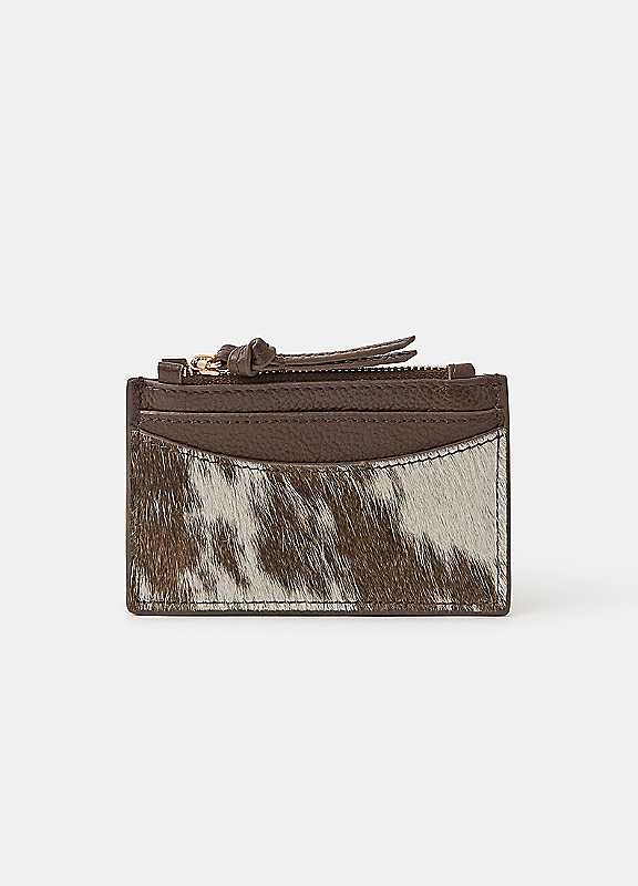 Crafted in leather and decorated with a contrasting cow print, this card holder features two slots and a top zip compartment for spare change and notes. Please note that due to the nature of this piece, colour and patterning on the leather may vary.Wipe cleanOuter: 70% Leather (Buffalo), 30% Leather (Cow)Lining: 100% PolyesterDimensions approx. 8H x 1W x 12L cm