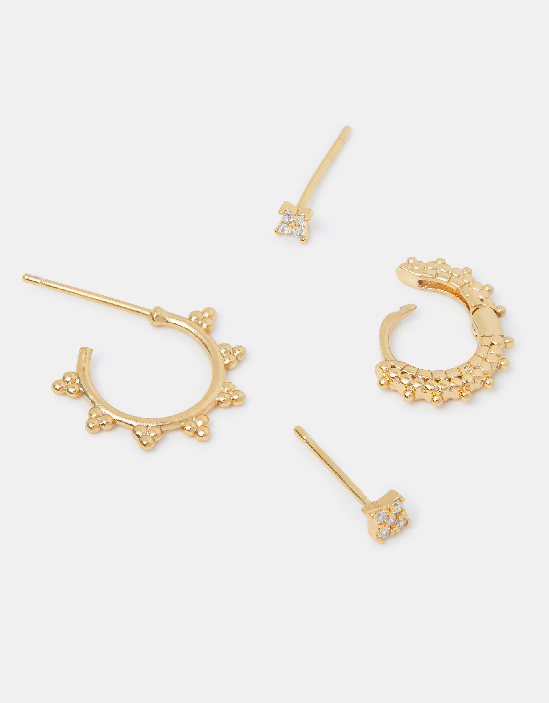 Part of the Z by Accessorize collection: jewellery designed to dazzle and shine, it’s plated in 14 carat gold for a luxe, longer-lasting finish. For a golden evening, wear these. Included are two pairs of cubic zirconia studs and two pairs of decorative hoops, sure to bring some sparkle to your jewellery box. Say hello to your new ear-stack! Four pairs included. Non-refundable.