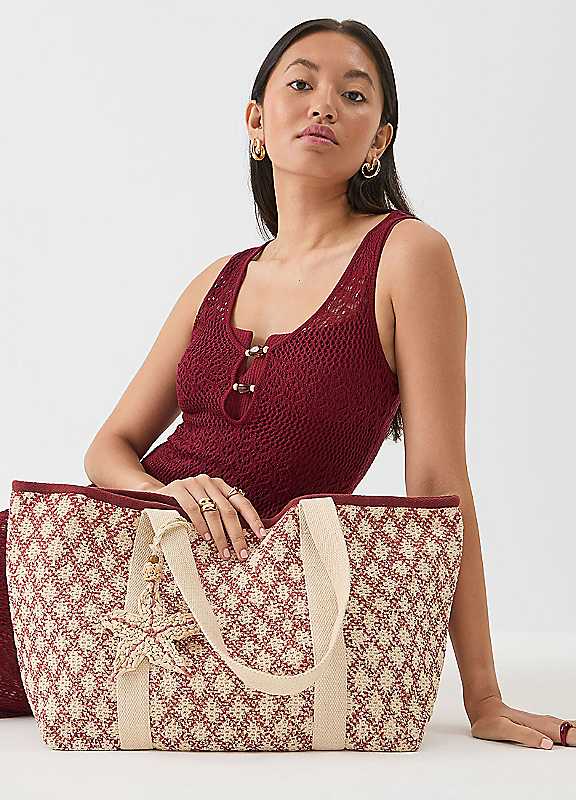 Whether you're shopping for holiday essentials or heading to the beach, this bag is an accessory you can use all summer long. Designed with a diamond pattern and crocheted finish, it features two sturdy shoulder straps, a magnetic button fastening and small slip pocket inside. Our favourite part? The raffia starfish bag charm attached to the front.Wipe cleanOuter & lining: 100% CottonDimensions approx. 28H x 27W x 27L cm
