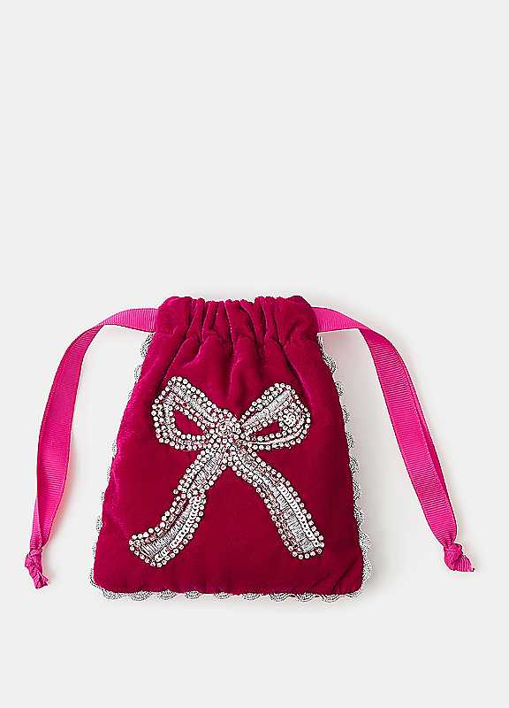 Getting some jewellery or small treasures for someone special? This drawstring bag makes a beautiful gift-wrap alternative. Designed in plush pink velvet, it's embellished with a sequin and diamant© bow motif on the front.Wipe cleanOuter & lining: 100% PolyesterDimensions approx. 14H x 1W x 12L cm