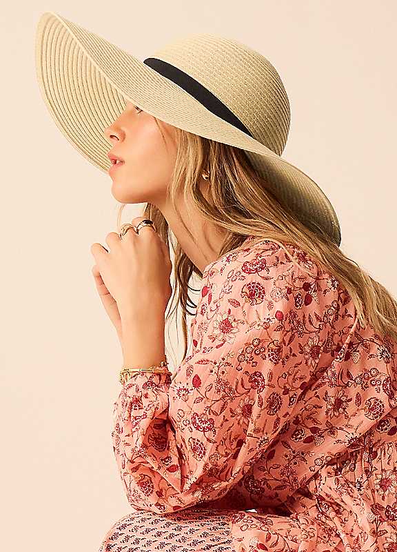 This screams summer. Whether you're driving down to the seaside for the weekend or planning your long-awaited tropical getaway, this floppy hat is a must-have for your bag. Designed with a black trim and gold-tone embellishment, you'll be the best dressed, even at the pool. Cheers! 100% Paper Length approx. 48 cm | hats with ribbon,summer straw hat,floppy sun hat,foldable straw hat,straw hat with wide brim,floppy straw hat,floppy summer hat,floppy beach hat,packable straw hat,packable beach hat