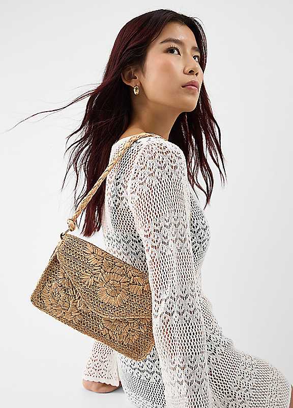 Secure that summer bag and get this one packed in the suitcase for all future holidays. Braided and woven in raffia with pretty floral designs, it's perfectly-sized for storing all your evening essentials, and cute enough to be your plus-one to every sunset dinner. Finished with a magnetic button fastening and small zip pocket inside.Outer: 98% Paper, 2% Polyurethane (PU)Lining: 100% Polyester (Recycled)Dimensions approx. 25L x 6W x 14H cm