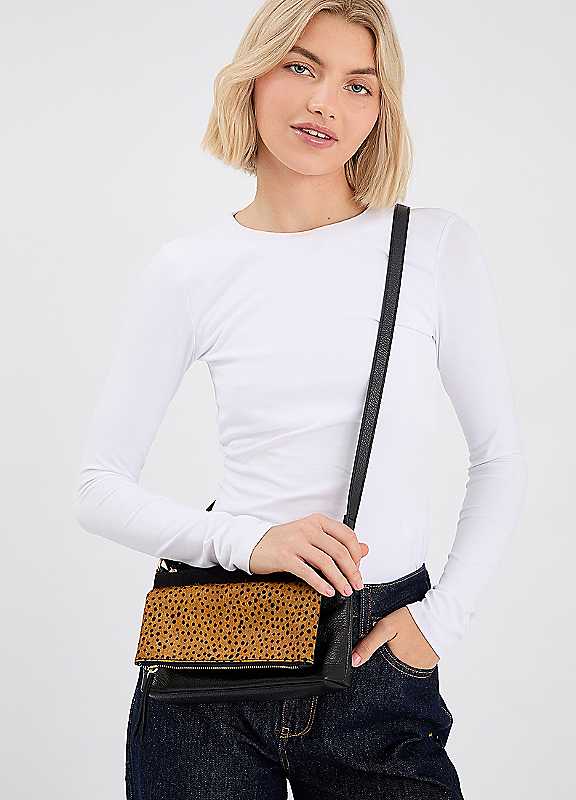 Accessorize Fold Over Zip Leather Crossbody Bag - Leopard - Size ONE SIZE