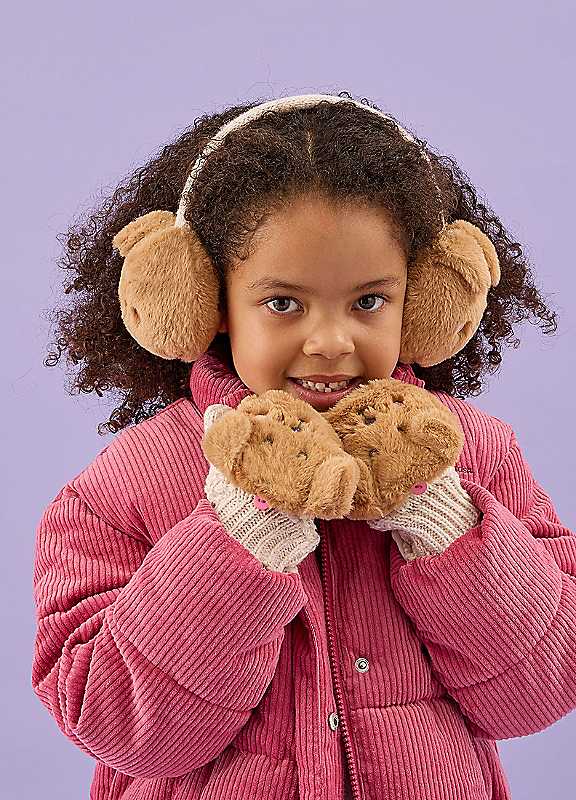 Keeping their little paws and ears warm and toasty all winter long, this set is a cute cold-weather essential. Covered with fluffy faux fur, these mittens and earmuffs feature an adorable sausage dog print that your little one won't get enough of.50% Acrylic, 50% Polyester | ear muffs winter, fluffy ear muffs, winter mitten gloves, winter mittens, animal print gloves, childrens mittens, faux fur gloves, faux fur mittens
