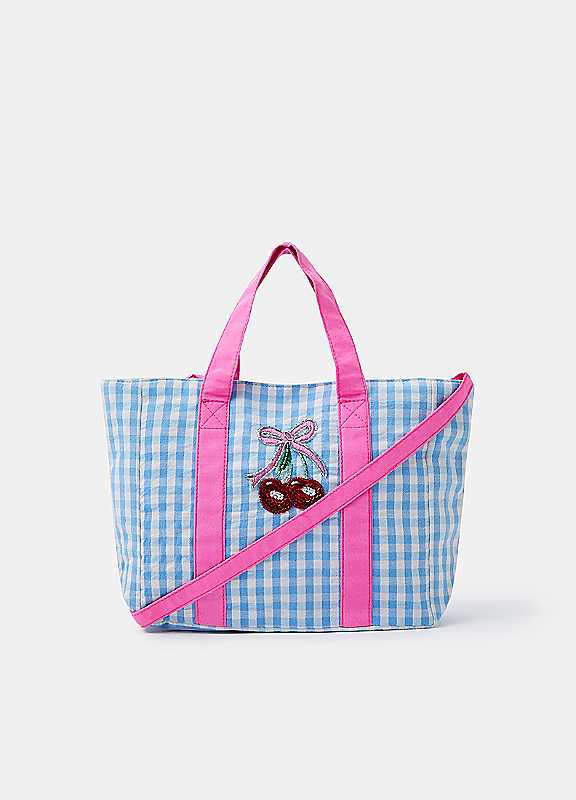 A cherry sweet accessory for shopping trips and play dates. Designed in a blue gingham print, this tote bag features a sequin-embellished cherry motif on the front with two top handles and an optional strap to wear across the body. Finished with a zip fastening and small slip pocket inside.Wipe cleanOuter: 100% CottonLining: 100% PolyesterSize approx. 17H x 17L cm