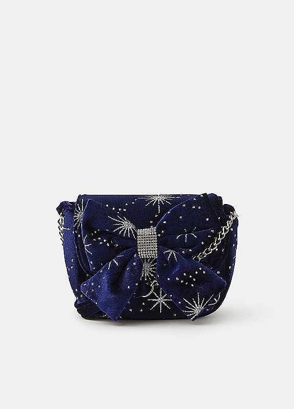 They've got the party dress, they're wearing their dancing shoes, now it's time for the sparkly bag! Made from navy blue velvet, the bag is splashed with glittery cosmic patterns and a diamant© bow on the front. Features a magnetic button fastening and long shoulder strap.Outer & lining: 100% PolyesterLength approx. 13 cm | long strap bag, navy glitter bag, navy blue bag