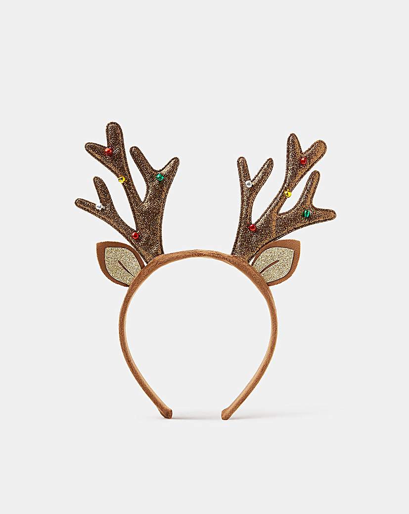Glitter Reindeer Antlers Headband Nothing screams Christmas quite as loud as these reindeer antlers. Decorated with mini bells, golden fabric and glittery 3D ears, this headband is going to be the life of any party. Covered in soft, fluffy material, it's a joy to wear all night long. Composite: Metal 5% , Plastic 20% , Polyester 75%