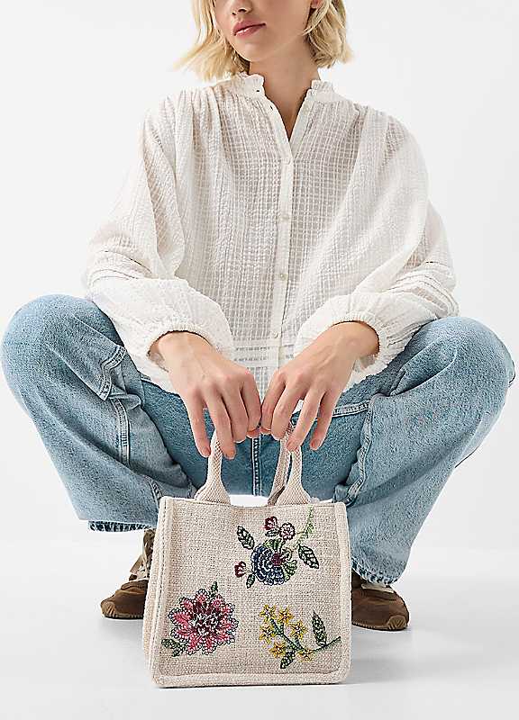 Ensure every quick trip to the shops is done in style. Designed with woven cotton, this miniature handbag is decorated with colourful embroidered flowers and sparkly bead embellishments. Features include two top handles, a detachable crossbody strap, inside slip pocket and magnetic button fastening.Wipe cleanOuter: 100% CottonLining: 100% PolyesterDimensions approx. 17H x 11W x 20L cm