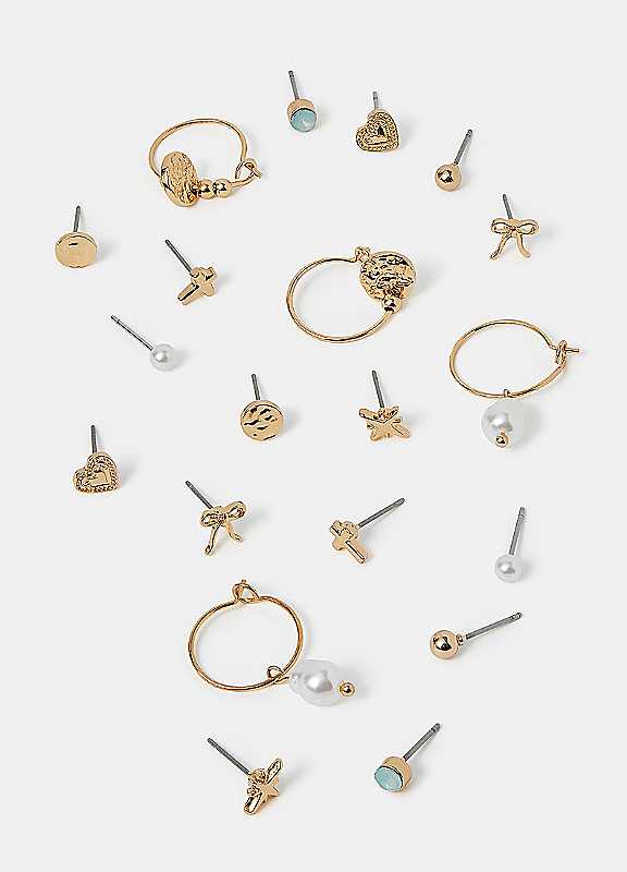 A dazzling addition to your jewellery box, this set include a mix of studs and charm hoop earrings. Dipped in a golden tone, the designs include pearls, crosses, coins, hearts, stars, bows, pearl and more. 10 pairs included.Wipe clean40% Zinc, 20% Glass, 10% Acrylic, 10% Brass, 10% Enamel, 10% IronLength approx. 1 cm