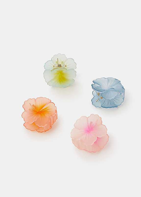 Off somewhere tropical? Don't forget these! Guaranteed to bring island energy to your holiday 'fits, this set includes four mini claw clips shaped like hibiscus flowers in yellow, pink, orange and blue. Four pairs included.Pack of 4Wipe clean95% Plastic, 5% IronLength approx. 4 cm | plastic hair clips, flower claw clip, multicolor hair clips, flower hair clips, plastic claw clips, hair claw clips