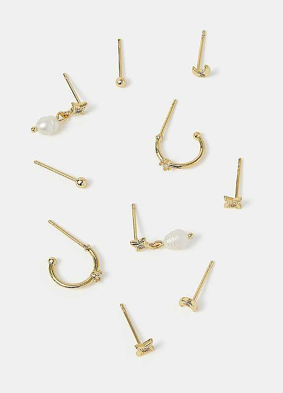 Part of the Z by Accessorize collection. Designed in celestial-inspired shapes with freshwater pearl insets and charms, these earrings are a dazzling addition to your earscape. 5 pairs included. Plated in 14 carat gold for a luxe, longer-lasting finish.Wipe clean55% Brass (), 25% Cubic Zirconia, 20% Pearl