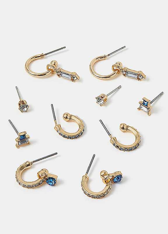 Beautiful in blue and perfect for all occasions, this selection of earrings are all encrusted with gemstones and diamantes for endless sparkle. Two pairs of studs, one pair of hoops and two pairs of charm hoops included.Wipe clean75% Zinc, 15% Steel, 5% Glass, 5% ResinLength approx. 5 cm | resin hoop earrings, classic stud earrings, blue stone earrings, diamante stud earrings, blue glass earrings, delicate drop earrings, glass hoop earrings, huggie earrings charm, dainty hoop earrings, small hoop earrings, rhinestone hoop earrings, gold stud earrings, stone hoop earrings, gemstone stud earrings, resin stud earrings, womens casual earrings, glass stud earrings