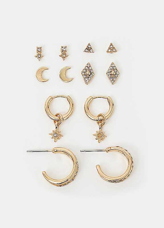 Create an earscape as dazzling as the night sky. Dipped in a golden tone with diamante embellishments, this set of earrings include four pairs of studs and two pairs of hoops with different star and moon designs.Pack of 6Wipe clean90% Zinc, 10% GlassLength approx. 5 cm