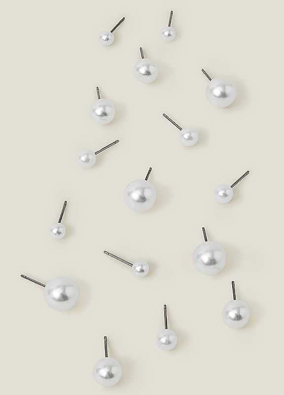No jewellery collection is complete without pearl earrings. Featuring eight pairs of faux peal studs, this set is designed in graduating sizes.90% Acrylic, 10% IronLength approx. 1 cm