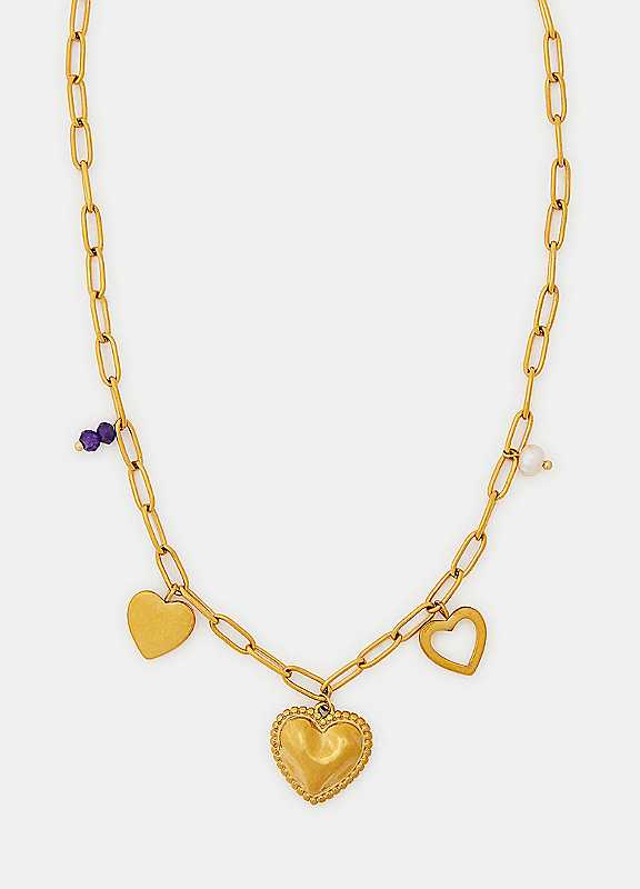 Crafted in durable stainless steel, this necklace is decorated with heart charms, gold beads and pearl embellishments dangling from the wide link chain. Fastens with a lobster clasp and extender.Wipe clean98% Stainless Steel, 1% Glass, 1% PearlLength approx. 50 cm | gold heart necklace, gold pearl necklace, gold chain necklace, necklace with clasp, pearl necklace chain, women's heart necklace, heart charm necklace, stainless steel necklace, heart chain necklace, heart pendant necklace