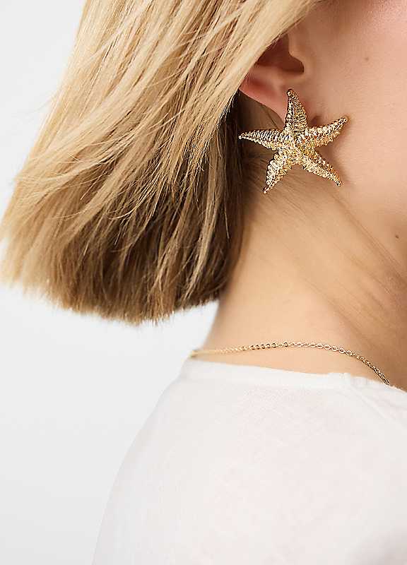 Whether you're lounging at the beach club or enjoying a romantic dinner along the coast, slip these stud earrings on. Featuring large starfish, they're dipped in a golden tone for a touch of glam.Wipe clean90% Zinc (Recycled), 10% SteelSize approx. 11L x 8H cm | large stud earrings,statement stud earrings,starfish earrings,stainless steel stud earrings,gold stud earrings