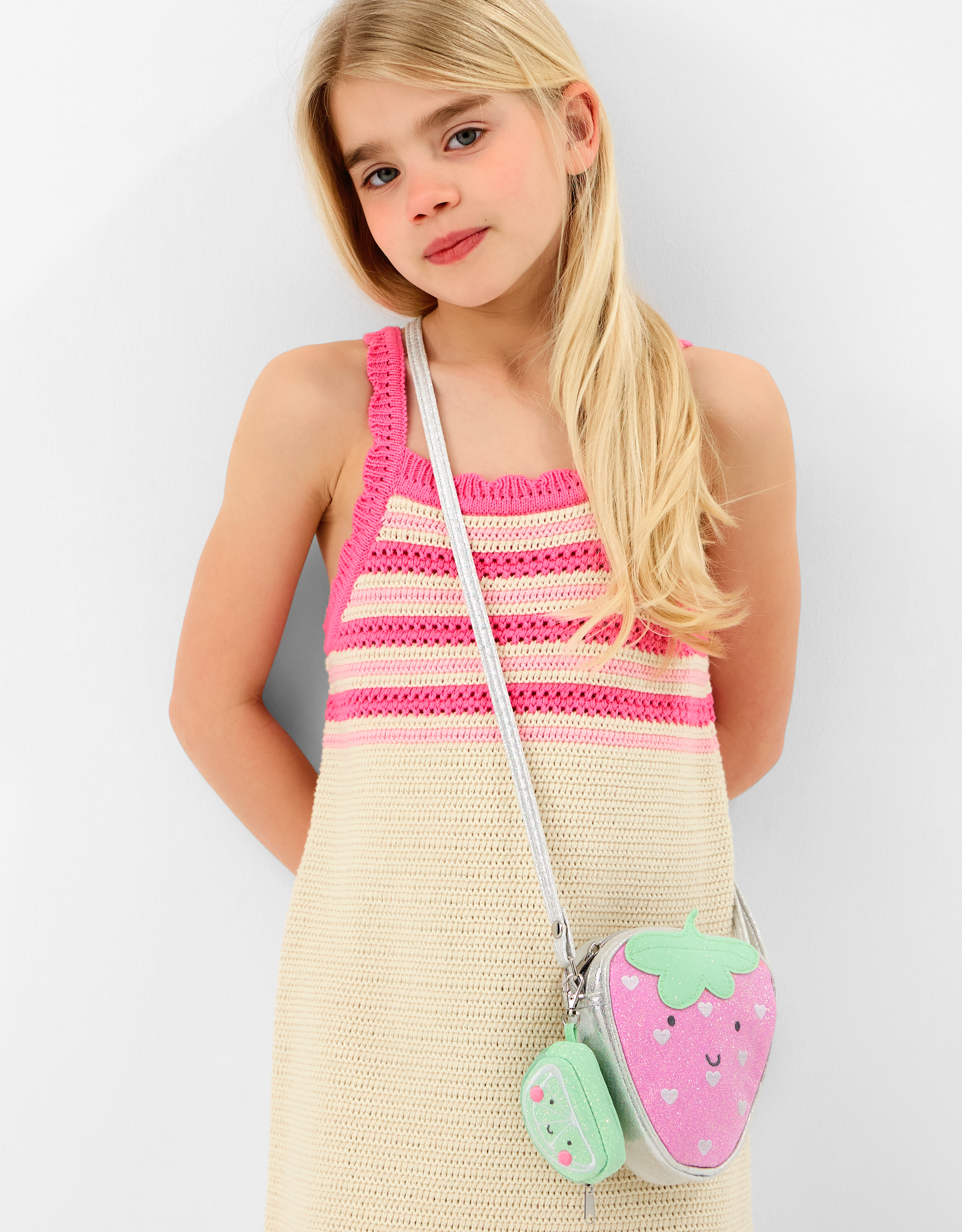 Shaped like a strawberry with a friendly face and glitzy finish, this bag features a zip fastening and long adjustable strap. Oh, and don't forget the detachable lime slice purse, too! Sweet, right?Warning! Choking Hazard—Small parts. Not suitable for children under 3 years old.