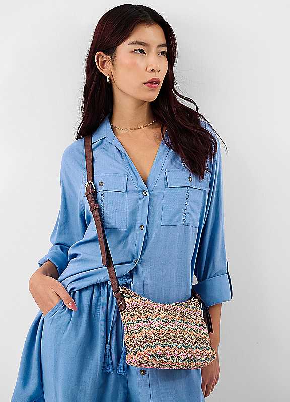 Sunny city break or relaxing getaway somewhere tropical - this bag is an essential for every type of sun-soaked holiday. Woven in raffia with colourful zig-zag stripes, it features a secure zip fastening, internal zip pocket for small essentials and adjustable crossbody strap.Outer: 80% Polypropylene (PP), 20% Polyurethane (PU)Lining: 100% Polyester (Recycled)Dimensions approx. 21L x 9W x 17H cm