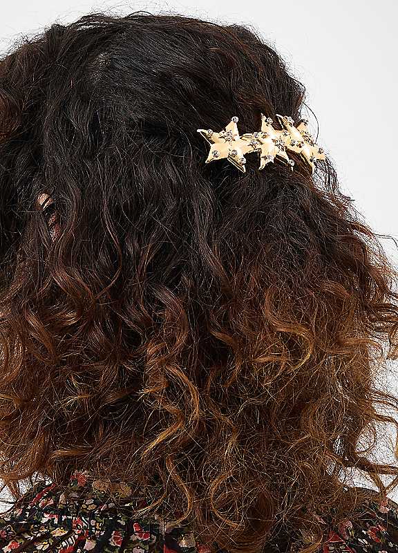 When it comes to fun hair accessories, we always reach for the stars! Designed in gold tone metal, this barrette clip showcases a trio of stars with sparkly diamante embellishments. Hurry, your half-up half-down do's are waiting.Wipe cleanComposite: 30% Glass, 10% Iron, 60% ZincLength approx. 6cm
